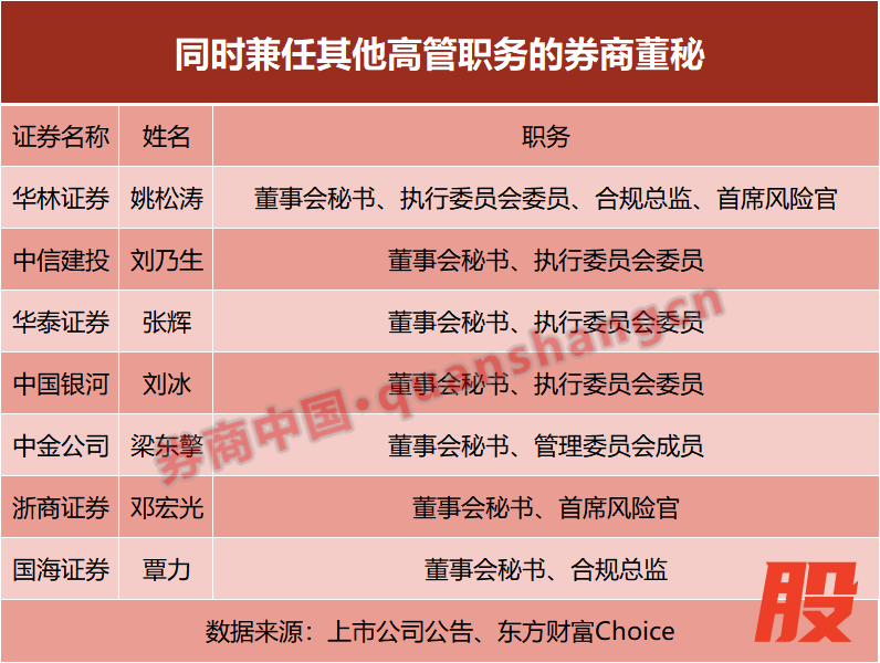 具体来看,华泰证券董秘张辉兼执行委员会委员;银河证券董秘刘冰兼任执行委员会委员;中信建投董秘刘乃生兼执行委员会委员;中金公司董秘梁东擎兼管理委员会成员;国元证券董秘李洲峰兼执行委员会委员;华林证券董秘姚松涛兼执委会委员、合规总监、首席风险官。